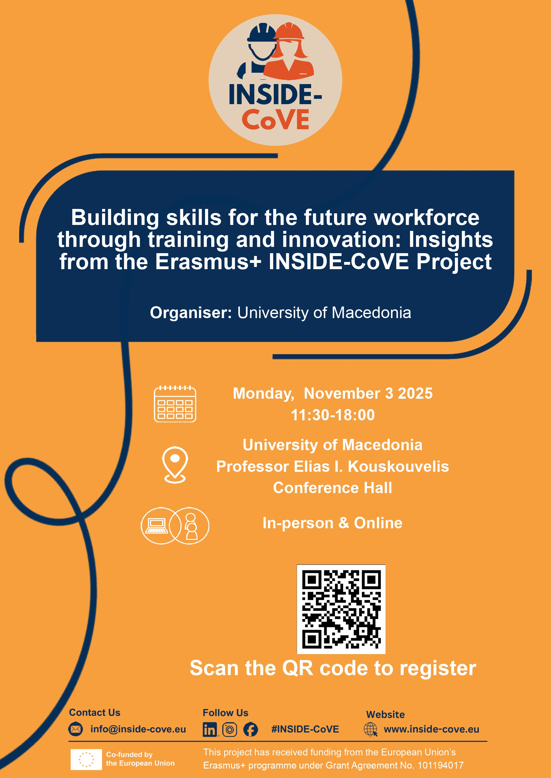 We are delighted to share the final programme and registration details for the 1st Multiplier Event of the INSIDE-CoVE Project, organized by the University of Macedonia. It will take place on Monday, 3 November 2025 (11:30–18:00) at the Professor Elias I. Kouskouvelis Conference Hall, University of Macedonia, Thessaloniki, and will be held in hybrid format, allowing participation both in person and online.